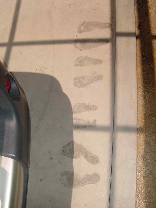 どうでもいいようなお遊びですが、記念に家族4人の手形を基礎の立ち上がり部分に、足形を車庫の土間コン部分につけました。