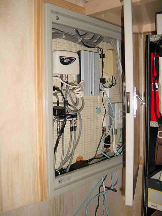 また、書斎の物入れに、電話、TV、LAN、空CD管の集中配電盤を設置しました。(写真では見えないですが、コンセントは4口。空配管も上に並んでいます。ルーターは熱を持つので、下に穴を開けてもらって、配電盤の下にあります。)