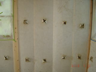 不織布で覆う前に外壁の合板に何カ所か調湿のため小さな穴を開けていました。